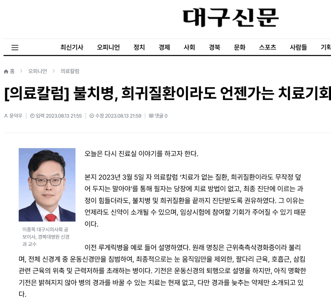 홈 알림 미디어 불치병, 희귀질환이라도 언젠가는 치료기회를 가질 수 있다 알림미디어 [의료칼럼] 불치병, 희귀질환이라도 언젠가는 치료기회를 가질 수 있다 By 이종목 - 2025년 9월 8일 270 0 FacebookTwitterNaverKakao Story 기사 원문 보기: [의료칼럼] 불치병, 희귀질환이라도 언젠가는 치료기회를 가질 수 있다 < 의료칼럼 < 오피니언 < 기사본문 – 대구신문 관련 기사저자에서 더 많은 [진료실에서] 이유없이 팔다리 힘 빠지면 ‘근육병’ 의심을 [진료실에서] 배·가슴 아래 감각 이상과 양쪽 다리에 힘이 빠진다면? 2025-07-26 “차라리 팔 잘라달라”···안락사 고백했던 CRPS환자의 반전 – 2021-08-22 로그인 환영합니다. ID와 비밀번호를 입력하여 주십시오. 사용자 이름 비밀번호 비멀번호를 잊으셨나요? 여기서 도움을 얻으세요. 개인정보 처리방침 비밀번호 복구 비밀번호 복구 이메일 이메일로 비밀번호가 발송됩니다. 회신 남기기 취소코멘트를 남기시려면 로그인