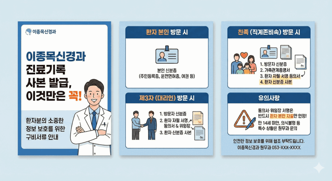 환자분의 안전한 의료 정보 관리를 위한 절차이오니, 다소 번거로우시더라도 너그러운 양해와 협조를 부탁드립니다. 관련하여 궁금하신 점은 언제든 접수처( 053-257-9988 )로 문의해 주시면 친절히 안내해 드리겠습니다.